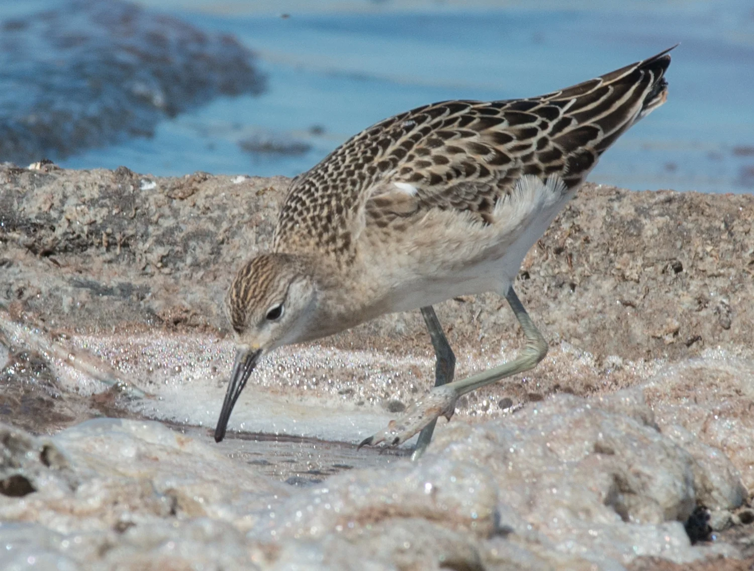 Birding and photographing wildlife keeps me centered on how wonderful nature is even with all the disrespect for it I see daily. A great photograph, when they happen, is in itself what keeps me going out in the field for that next one. So add to a good photograph a life bird and it becomes down right thrilling. A Ruff showed up in the A12 salt pond in the Alviso area of north San Jose, CA last week. I stopped by on my way home from my engineering job a couple of days after the first report in hopes of seeing the bird. I first walked west but no signs of the Ruff so I walked back to the county park and found the bird in the SE corner of the salt pond. There were Least and Western Sandpipers as well as Red-necked and Wilson's Phalaropes feeding in the foam the NW wind had formed in this part of the pond. The Ruff was about 10 meters away feeding at the water's edge and what a great moment. I had my camera set up for the strong sun and zoomed to 200mm. I approached slowly and found a board to sit down on hoping the Ruff would approach closer. I took a few quick shots to get the documentary shot out of the way and then I focused on composition. I didn't push up the shutter speed beyond 1/800s so I could keep the ISO360 low and increase the f/stop to f/10 for a wider depth of field. The Ruff did move closer and the image below was taken when the bird walked to about 5 meters of where I was sitting. This is a good example where wading birds tend to move slower than warblers so a fast shutter speed wasn't as important as closing down the aperture to get a nice depth of field.