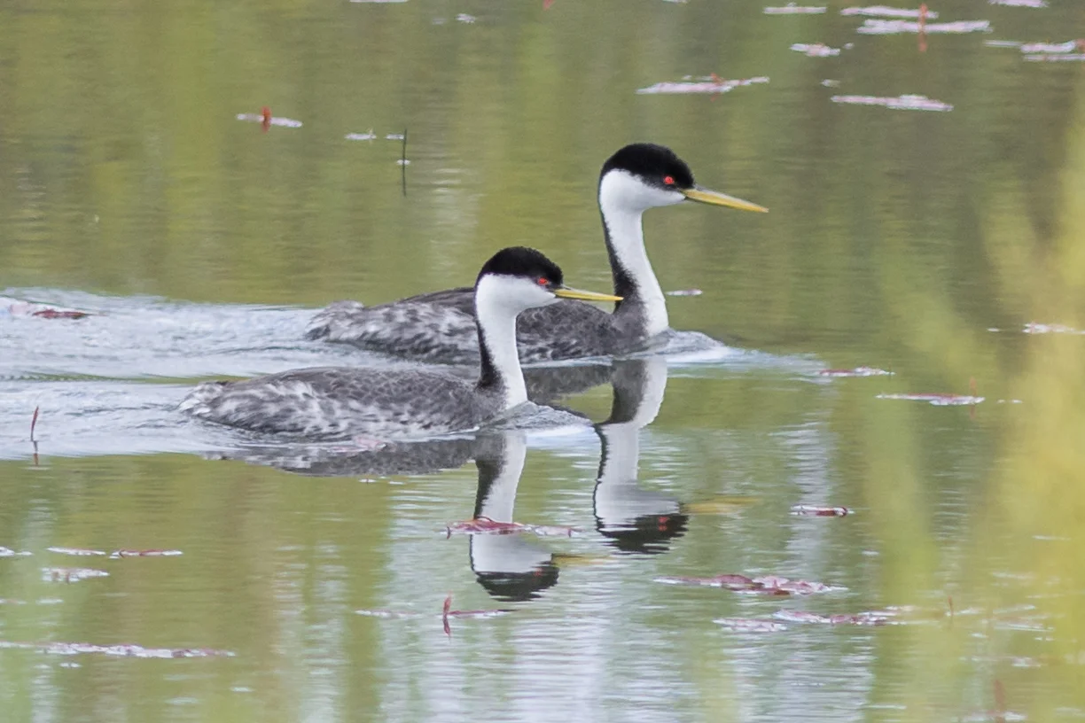 The Western and Clark's Grebes again winter along the West Coast and head inland to breed. The Western Grebe breeds throughout Nevada and over a wider range compared to the Clark's Grebe that commonly breed in only 2 main areas one being central Colorado and New Mexico and in Northern Nevada from Lake Tahoe Northeast California and into southern Oregon. Although very similar they don't commonly interbreed probably because of the differences in vocalization. The main differences are the bill with the Clark's being more yellow and a little shorter and the face pattern with the Western having more black that extends below the eye.