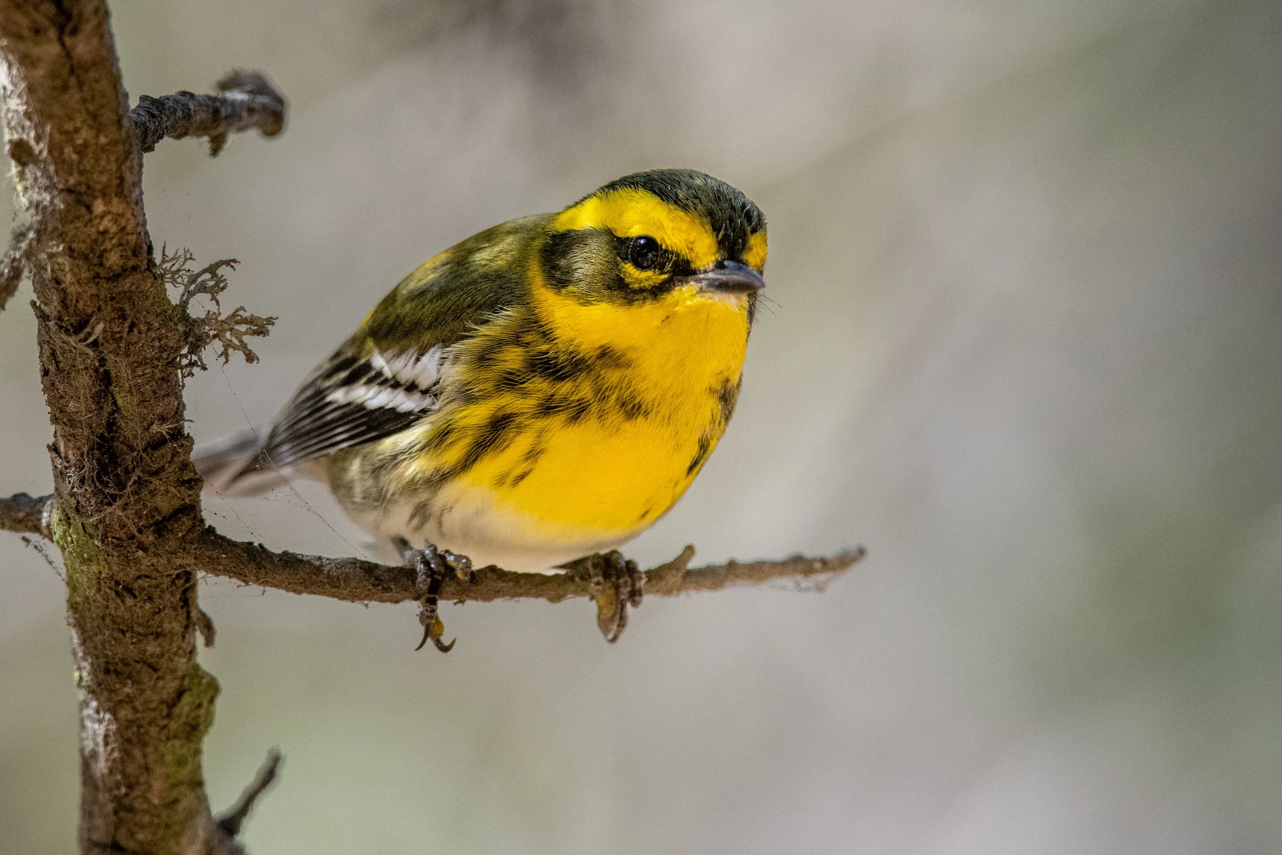 The Townsend's Warbler is a small songbird native to the western parts of North America and winters along the Pacific Coast. They do migrate through my home in the Reno area and I see one once or twice a year during migration. It yellow and black plumage, streaked chest, and a bold black mask across its face makes it easy to identify. It typically inhabits coniferous forests, where it forages actively among trees and shrubs for insects and spiders.